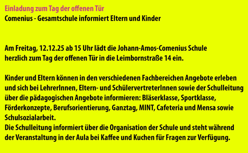 Die Comenius - Schule war bei vielfältigen Veranstaltungen dabei. Jüngst trat z.B. unsere Schulband im Schlachthof auf, IK - Kinder konnten an einem Tanzworkshop teilnehmen und ein Buß- und Bettagsgottesdienst wurde erneut organisiert.